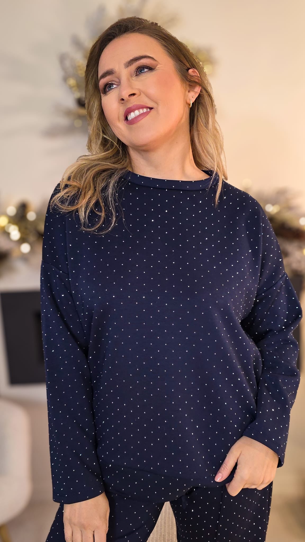 Shine with confidence in this elegant navy sweater adorned with sparkling diamante details. Perfect for those moments when you want to feel special, it combines comfort with glamour effortlessly. Let this piece be your go-to for adding a hint of sparkle to any occasion.