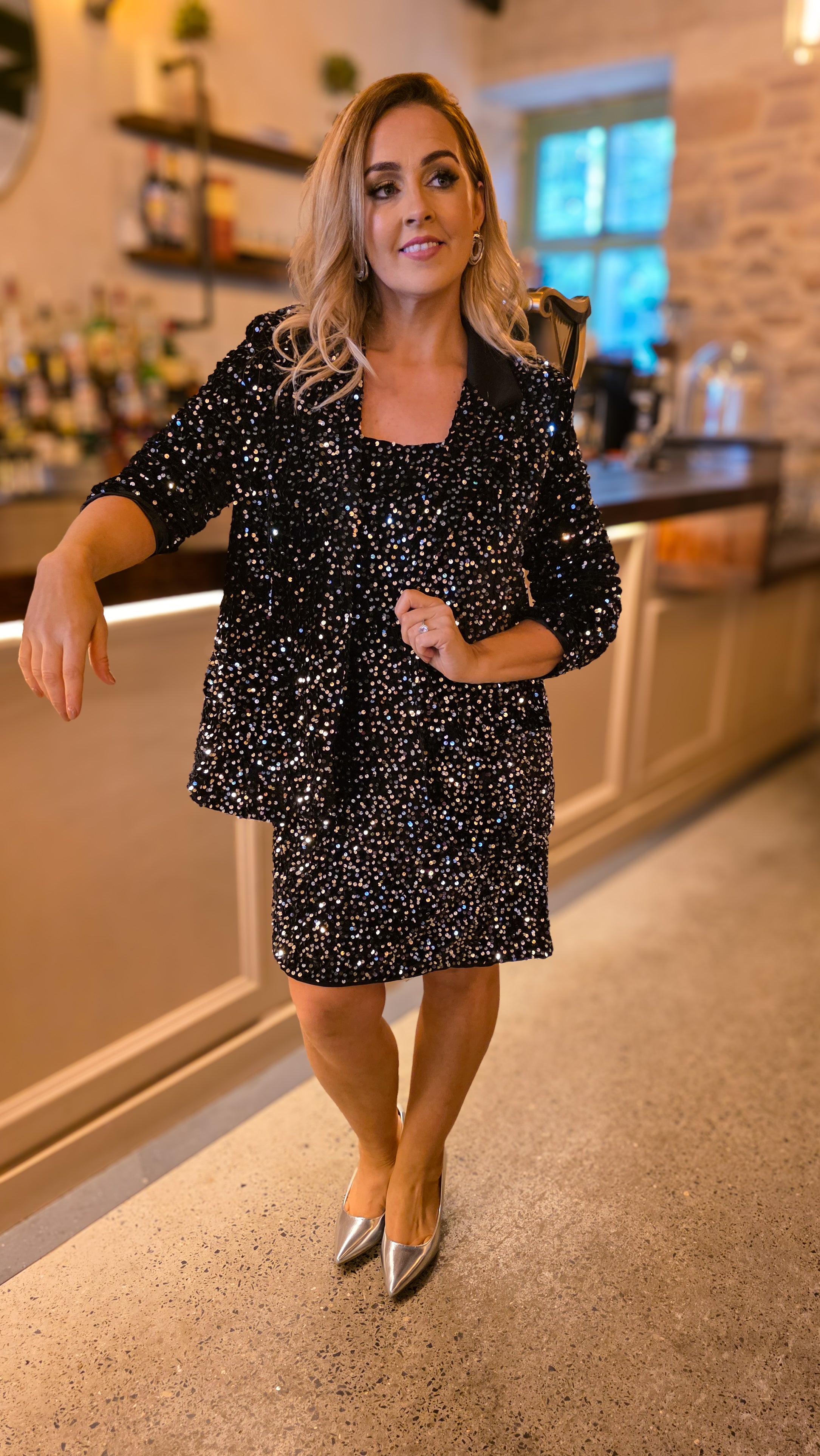 This Madison blazer in black features silver elegant sequin detailing, adding a touch of sparkle to your outfit.