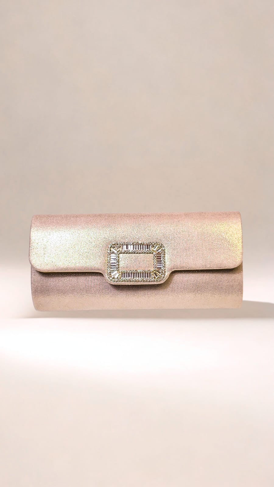 A shimmering gold satin clutch featuring a bold square buckle adorned with sparkling jewels.