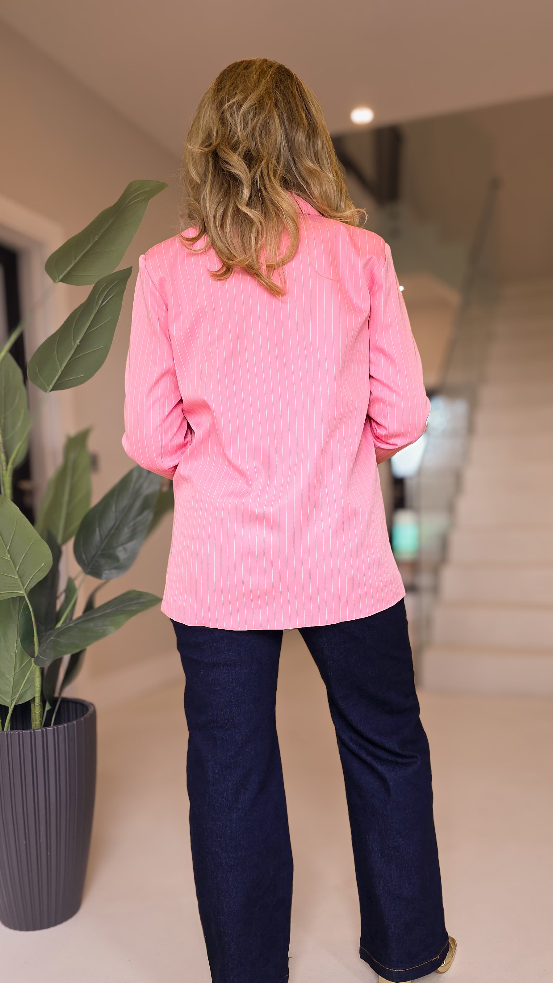 Make a statement with this striking pink blazer, elevated by crisp white stripes and playful patchwork detailing. Perfect for adding personality to your everyday look or creating a bold ensemble that turns heads.
