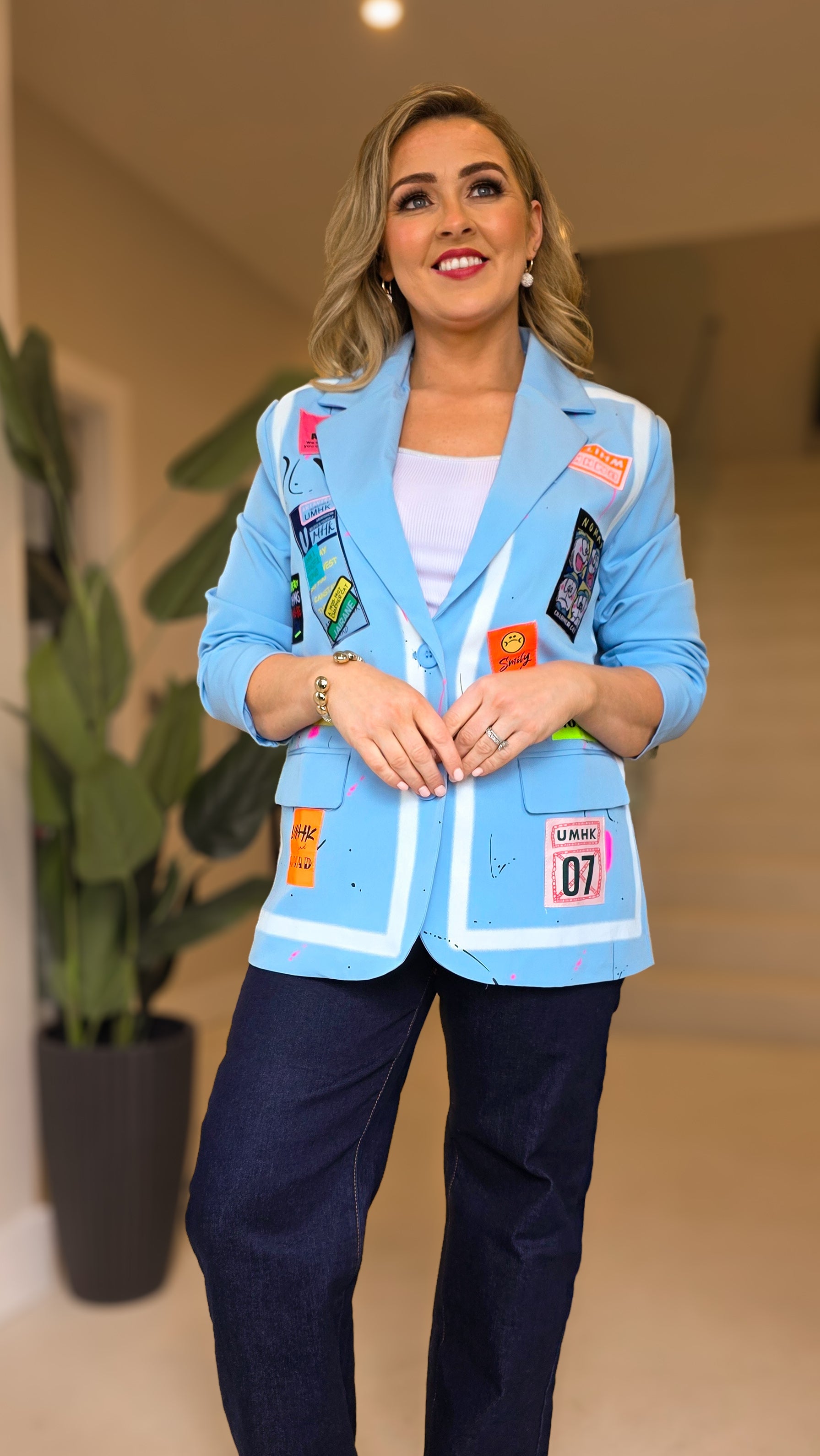 Elevate your wardrobe with the Kaz Blazer in blue, a versatile piece. Featuring distinctive graphic patchwork detailing, this blazer adds visual interest and personality to any outfit. The tailored silhouette flatters your frame while the premium fabric ensures comfort throughout the day. The Kaz Blazer is your go-to for polished, contemporary styling.
