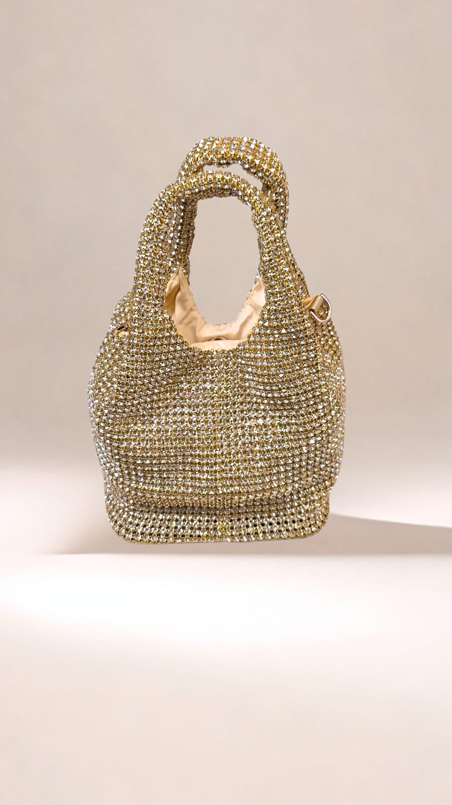 Add a dash of sparkle to your outfit with this playful gold clutch, sprinkled with dazzling diamond details. Small but mighty, it’s perfect for keeping your essentials close while you steal the spotlight at any event. Shine bright and have fun flaunting your fabulous style!