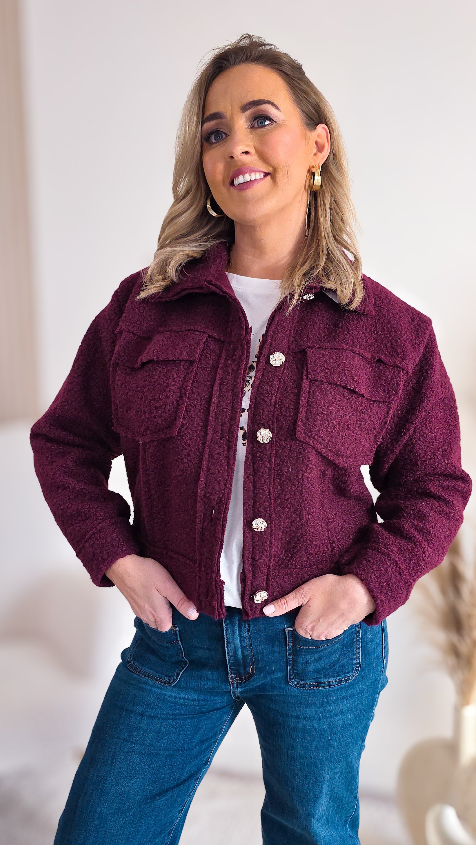This is the cozy and stylish Teagan Wine Coatigan perfect for adding warmth and charm to your outfit.