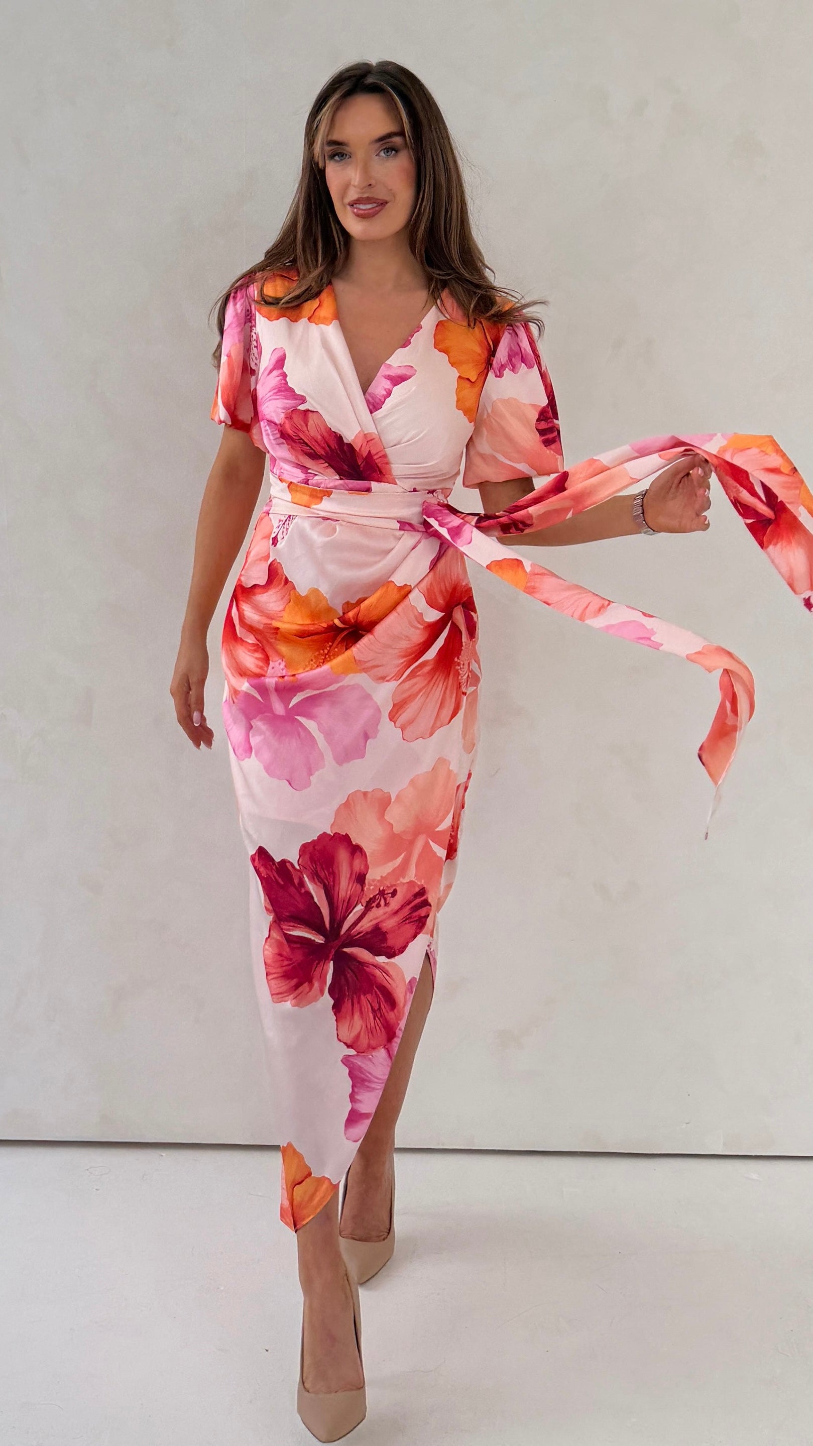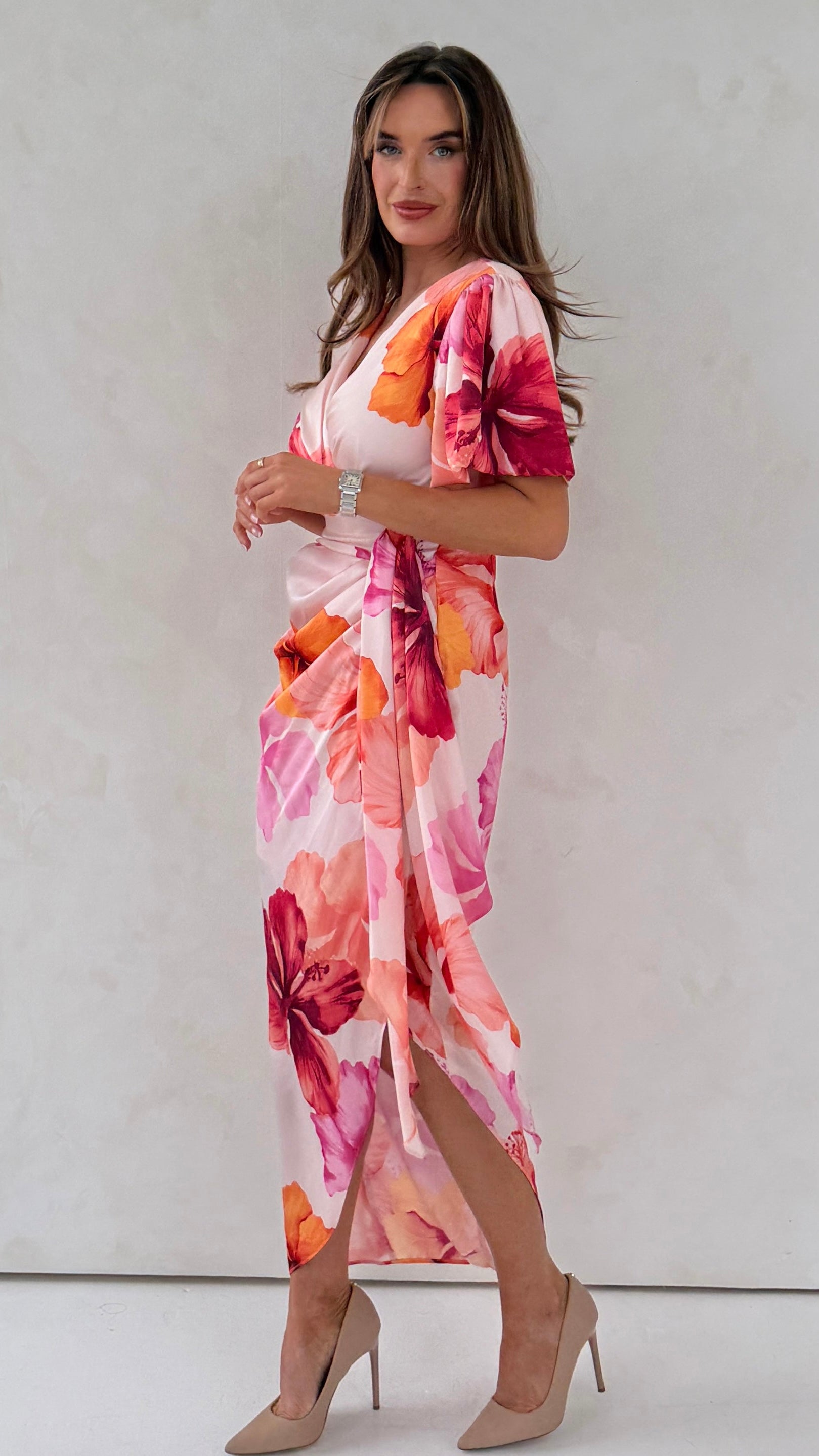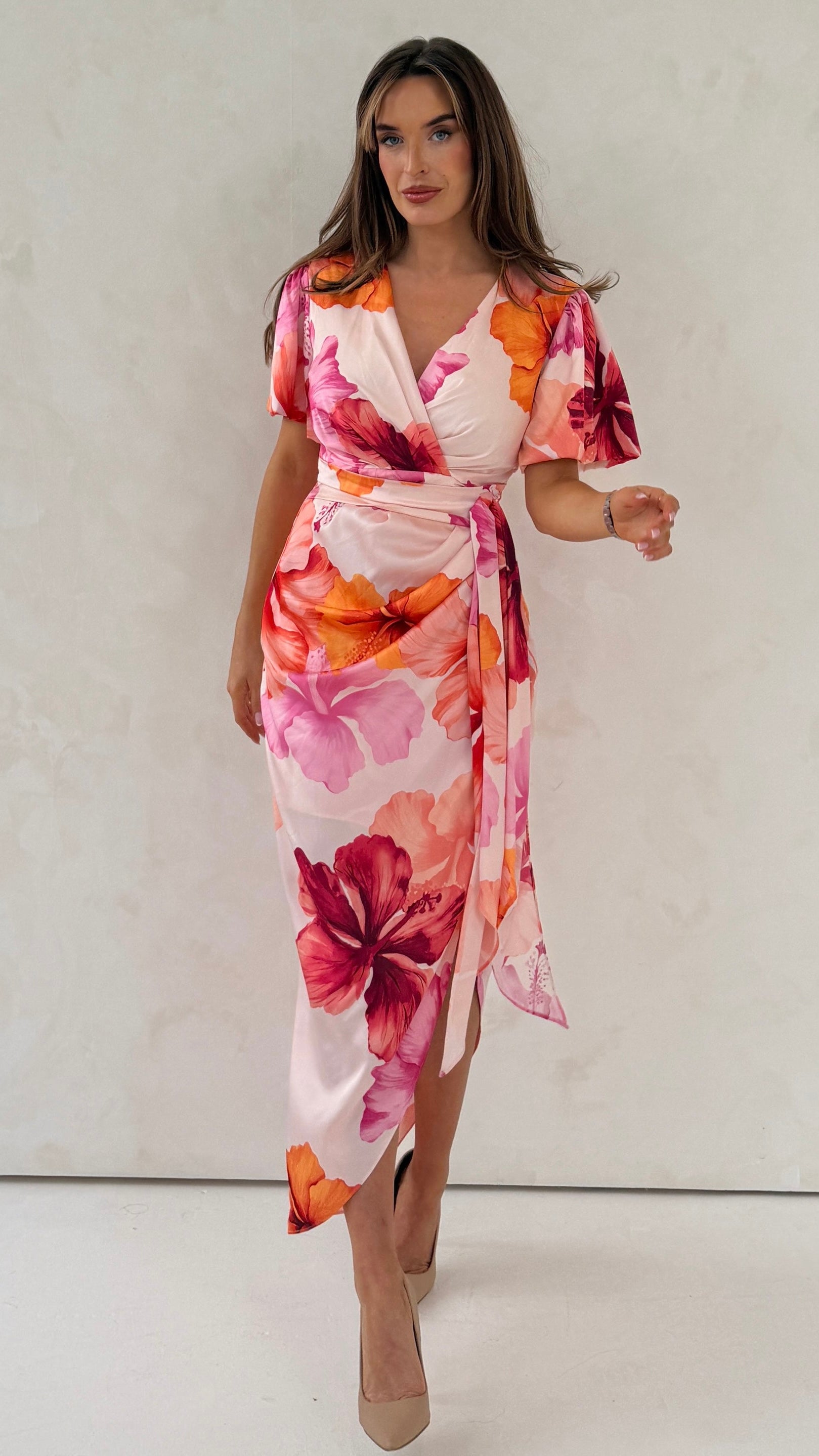 Elevate your summer wardrobe with this Drew puff sleeve wrap front midi dress. Featuring a vibrant print and flattering wrap-front silhouette, it's the perfect choice for garden parties, brunches, or special occasions. The voluminous puff sleeves add contemporary flair while the midi length offers timeless elegance. Versatile enough for day events yet polished enough for evening celebrations, this dress brings effortless sophistication to your seasonal style.