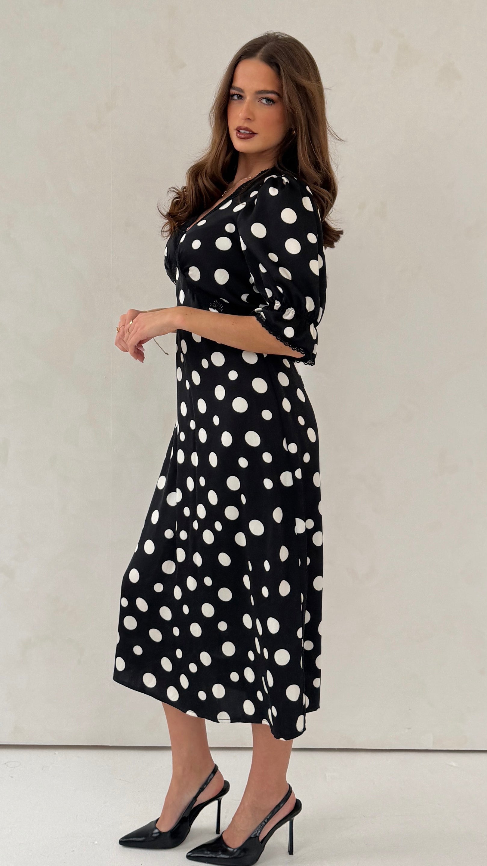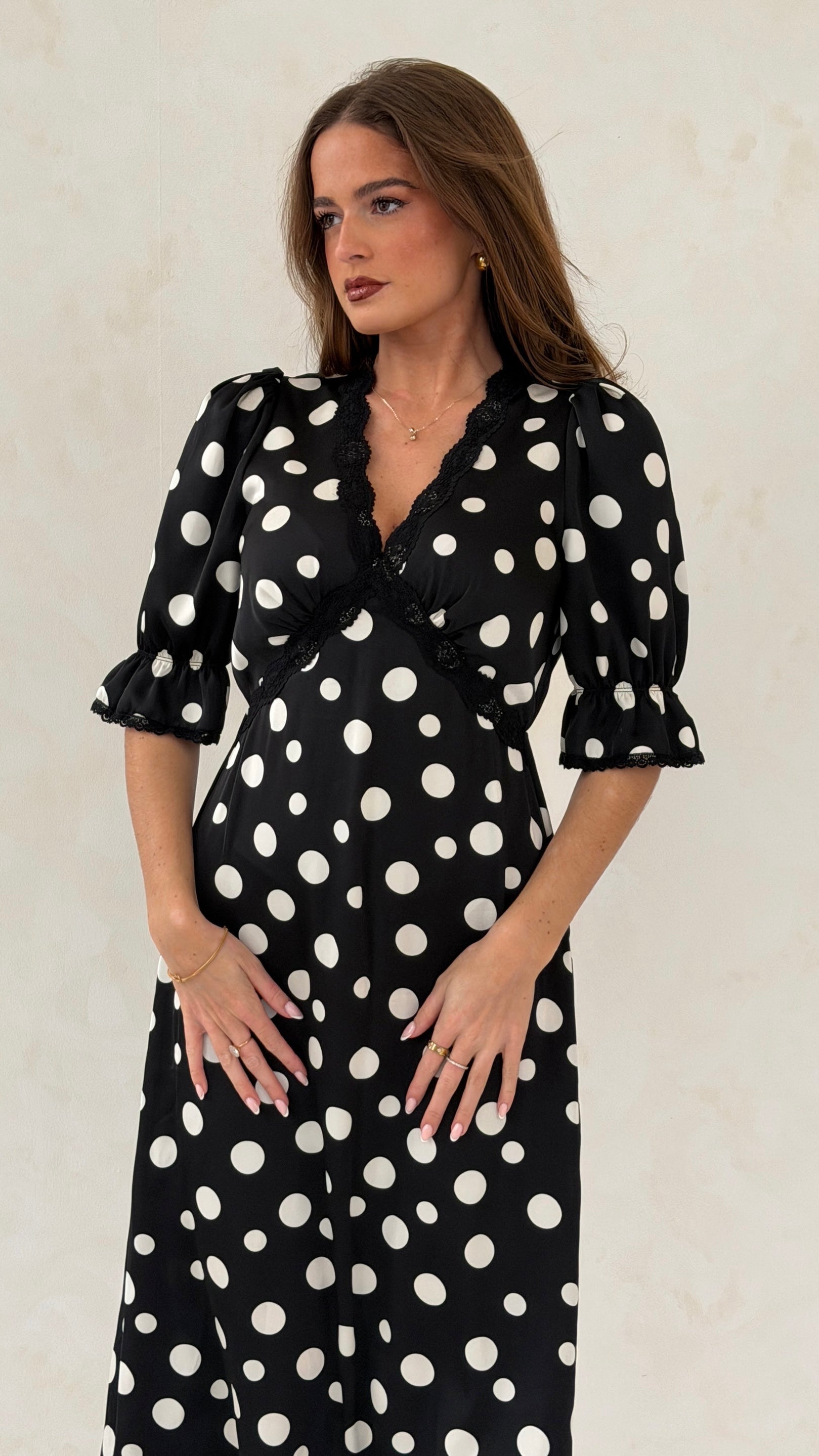 Introducing the Sharon Midi Dress, a timeless piece designed for effortless femininity. Crafted from lightweight fabric with a delicate dotted print, this dress features a flattering V-neckline edged with scalloped lace and softly gathered puff sleeves for a romantic touch. The empire waistline flows into a graceful midi skirt, offering both comfort and elegance. Perfect for daytime occasions or evening dinners—pair with heeled sandals and subtle gold jewellery for a polished look.