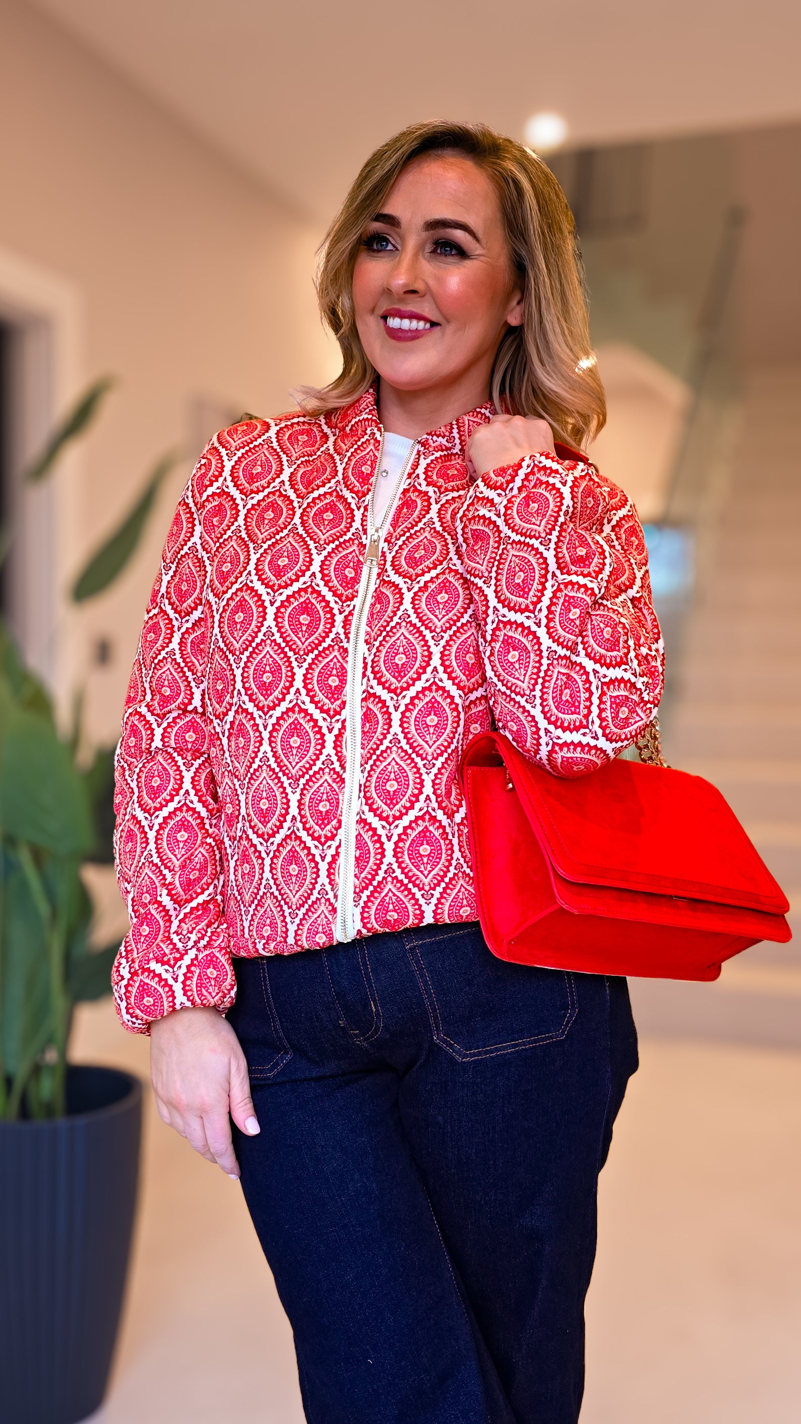 Make the Nancy Bomber your wardrobe essential with its striking paisley-inspired pattern in a versatile red shade. This jacket is designed to complement your personal style, offering the ease of layering with undeniable elegance. From casual outings to more polished moments, it's the piece you'll reach for again and again.