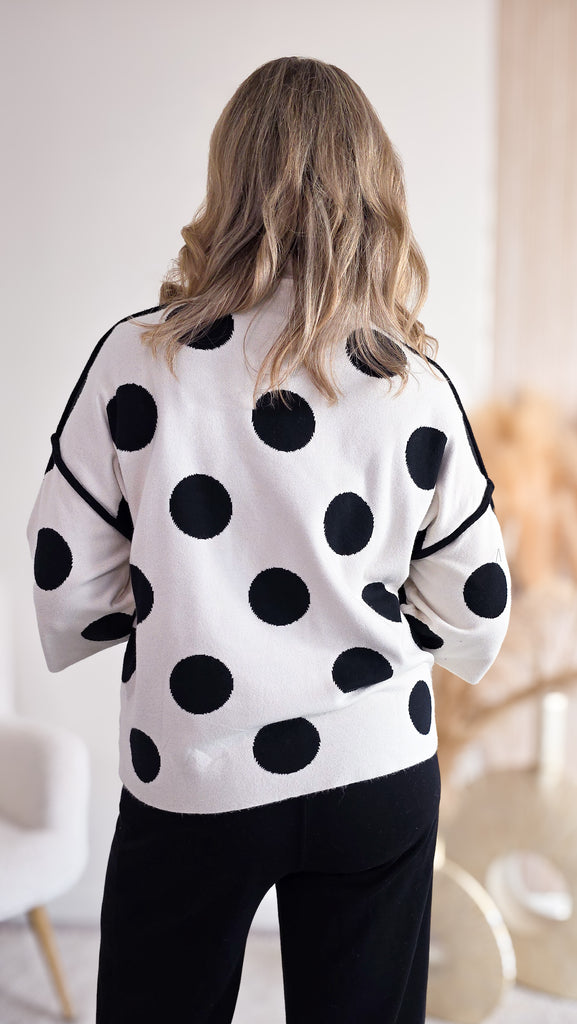 The Avery knit in white features a charming black spot pattern for a subtle yet stylish look.