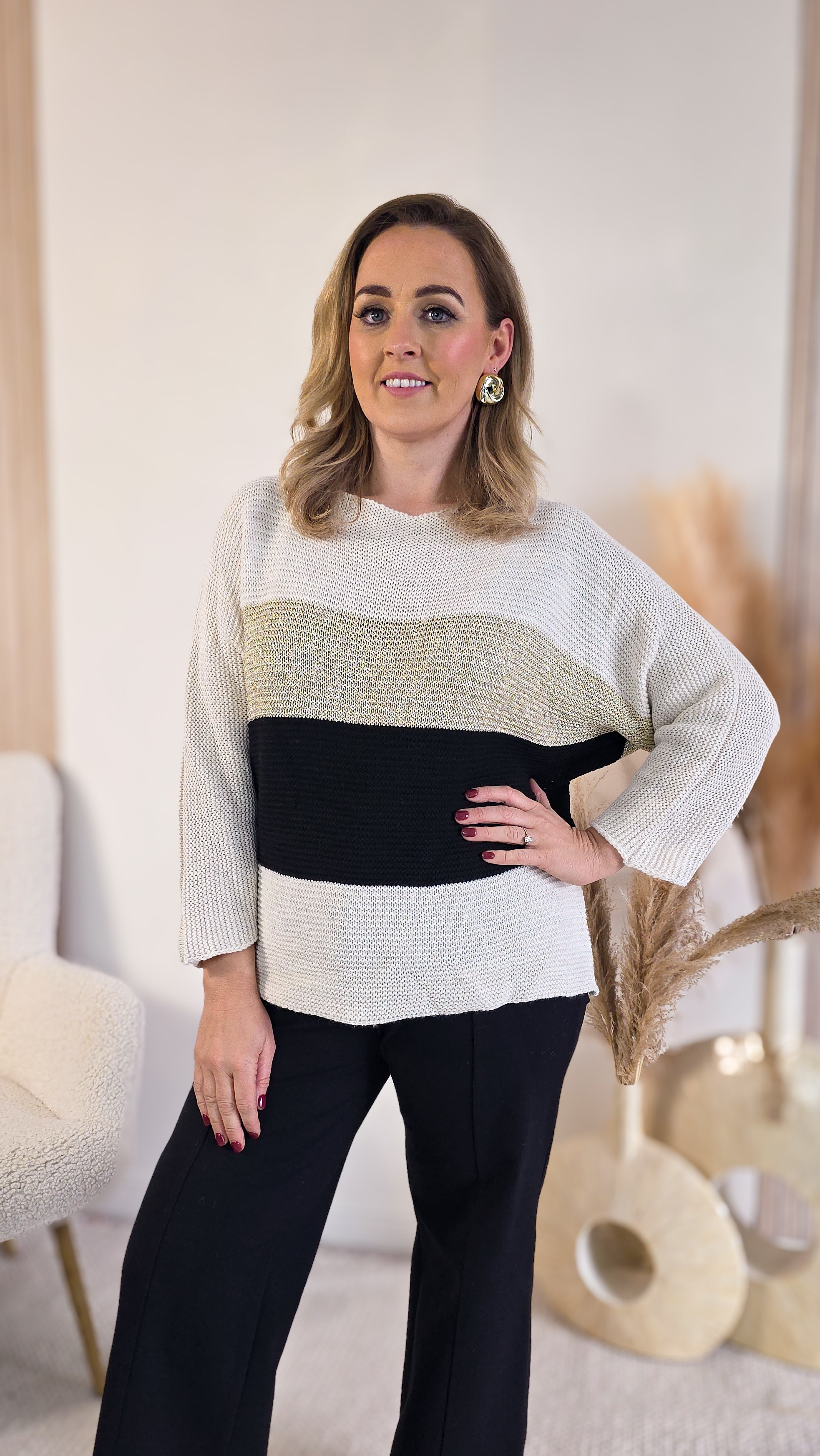 This Elena knit showcases a stylish blend of beige, gold, and black hues, adding a vibrant touch to your wardrobe.