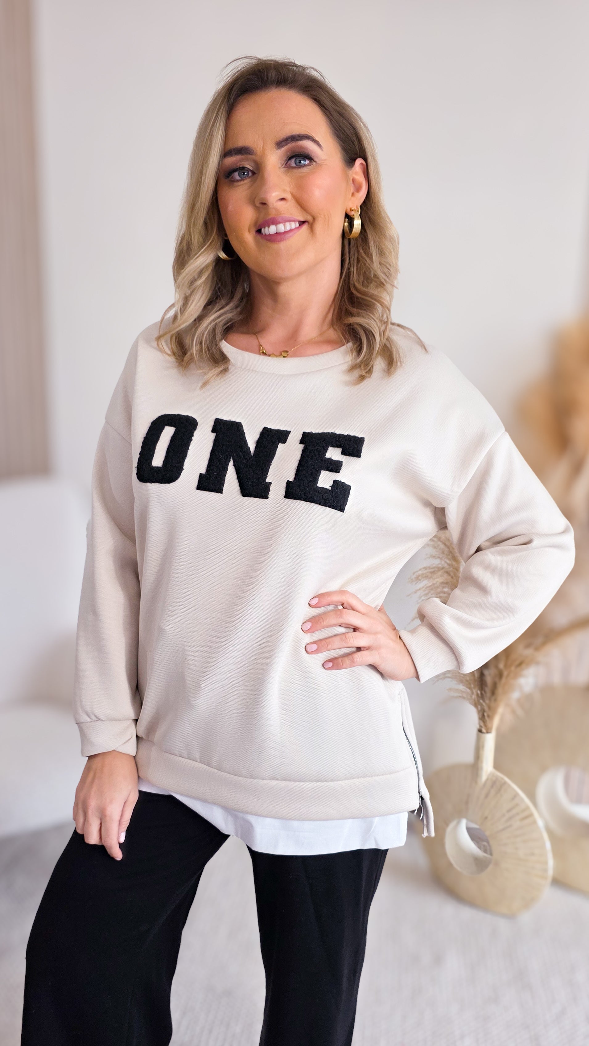 This Holly sweater in a beige colour features striking bold lettering on the front, making it both stylish and comfortable.