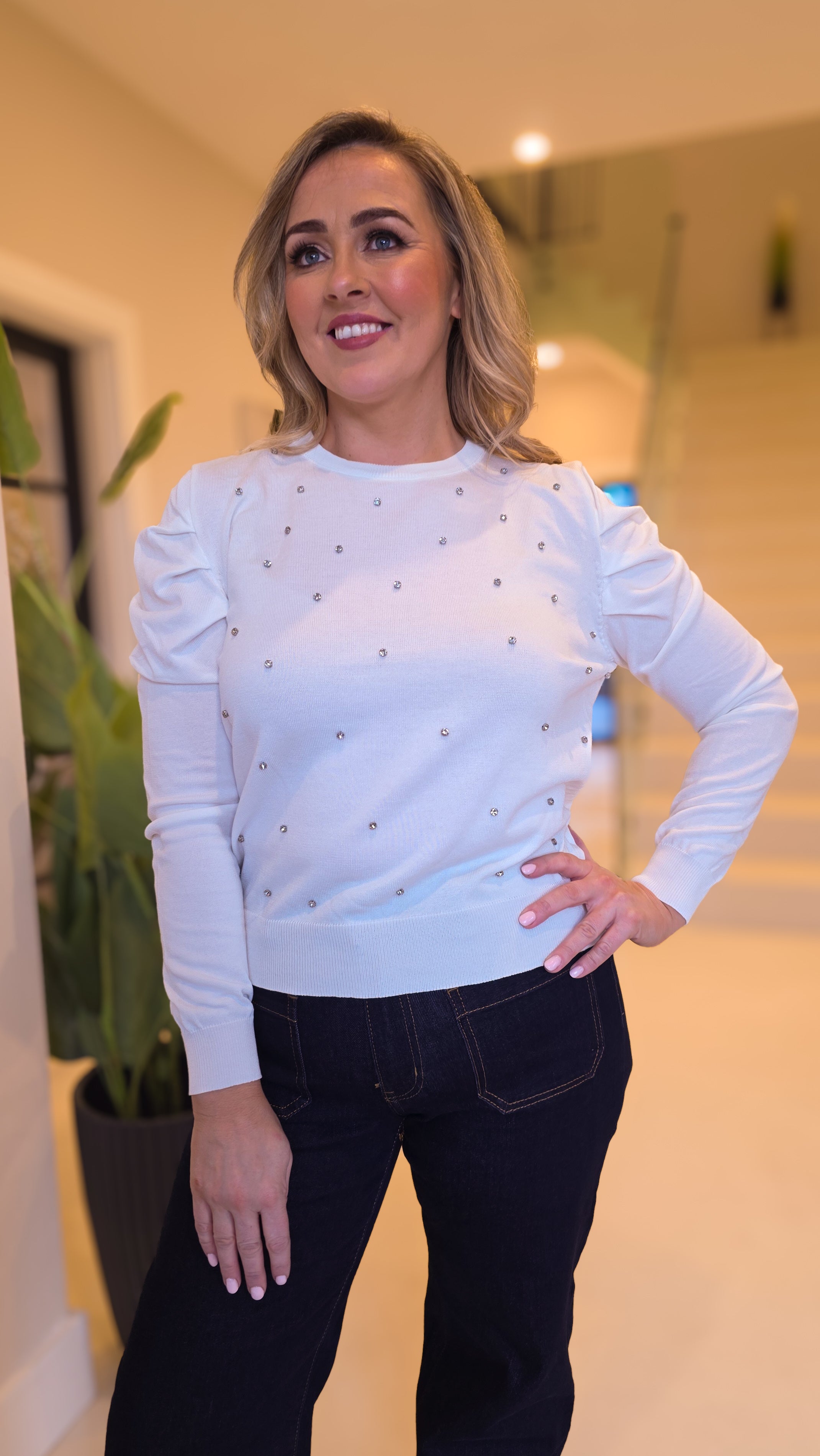 Discover the Kim Top, a beautifully crafted white long sleeve knit that combines comfort with understated elegance. Adorned with jewel details that catch the light, this piece is designed to help you feel confident and polished.