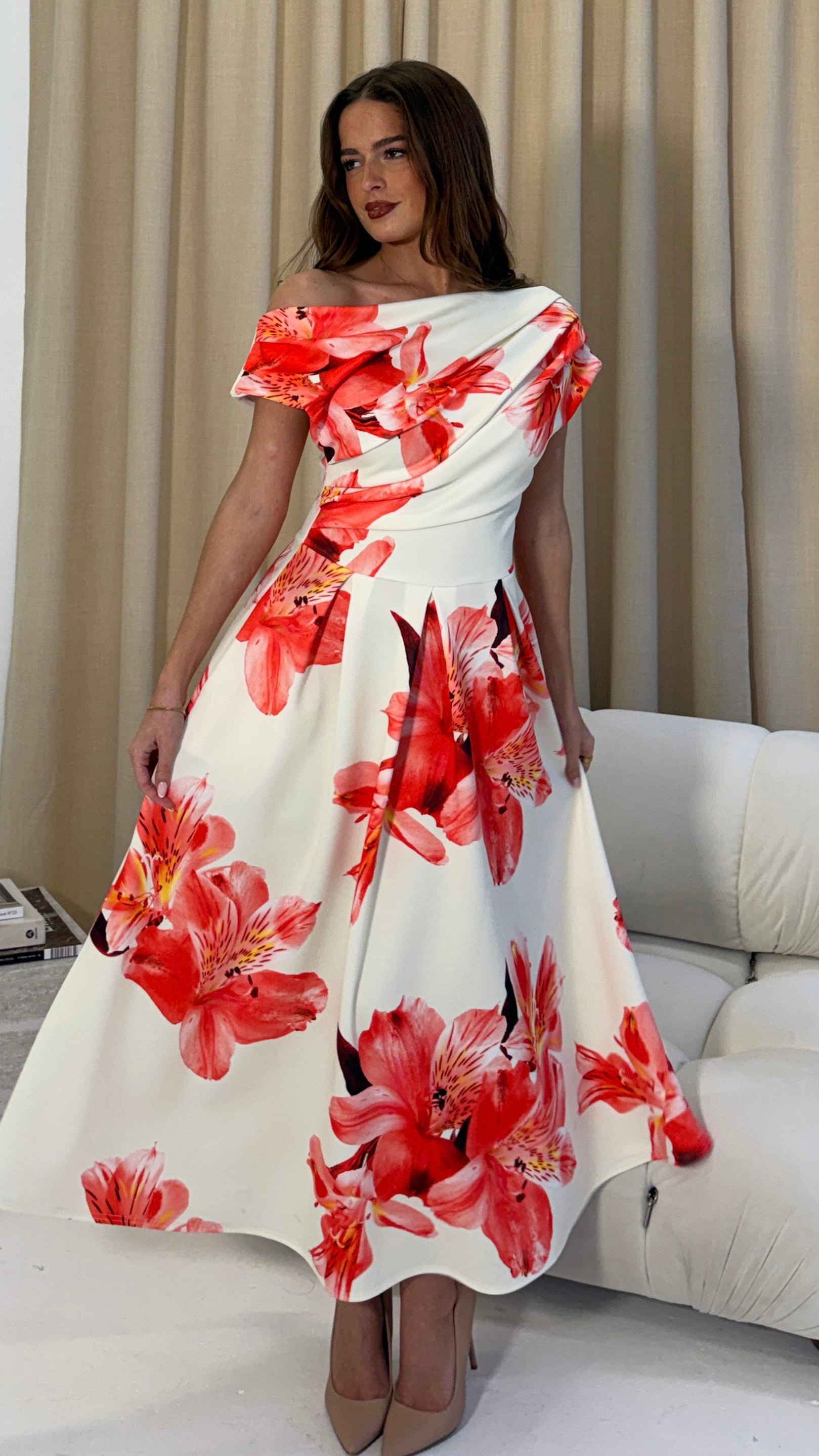 Experience modern elegance with the Betty Asymmetric Neckline Midi Dress - a classic, statement piece crafted from the highest quality materials for a luxurious feel. Its unique asymmetric neckline provides visual interest, while the sleek skater skirt silhouette flatters the figure, creating an exquisite look that will never go out of style.