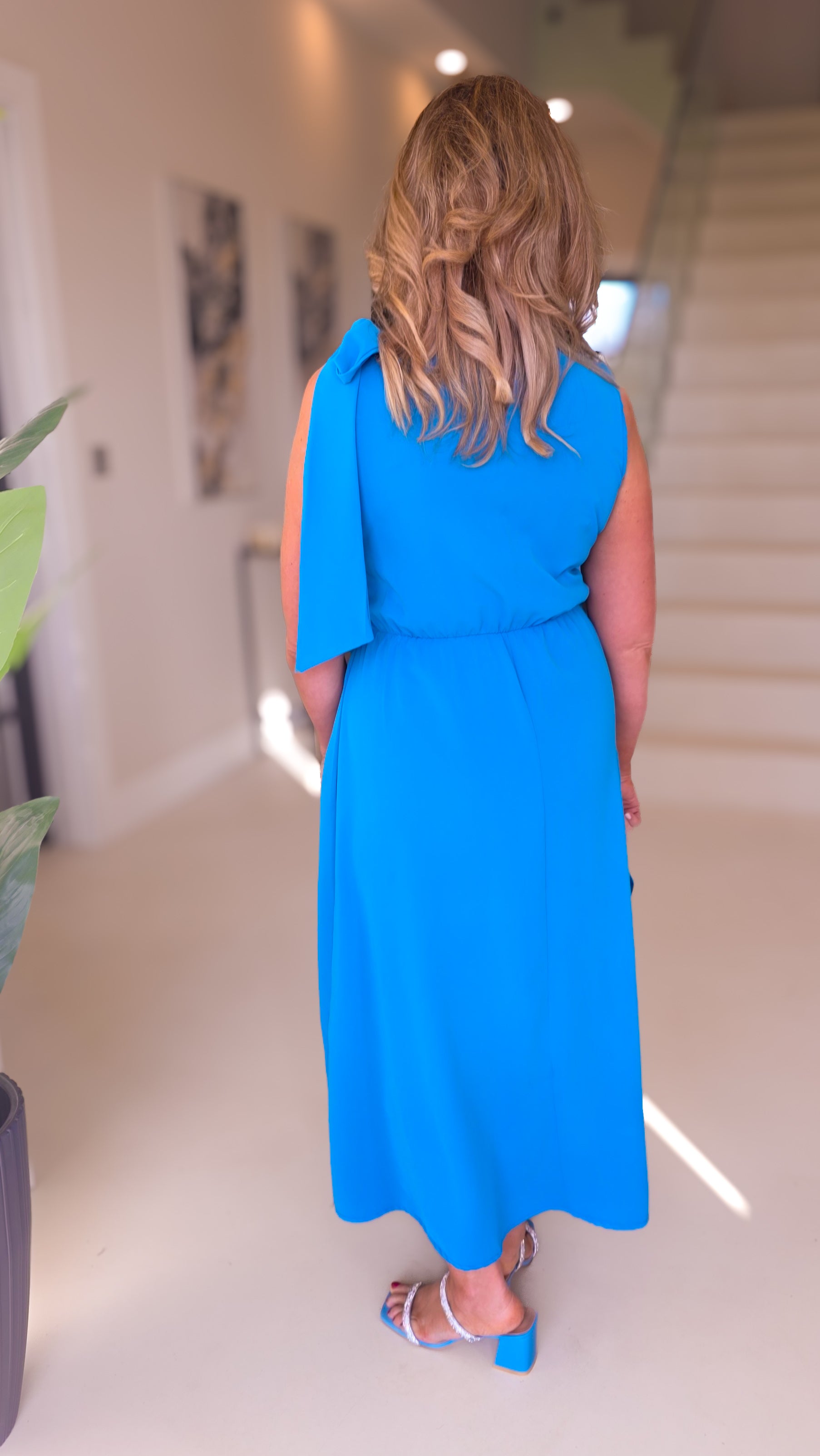 This elegant, midi-length design with a soft A-line silhouette that moves fluidly and flatters the figure. It is sleeveless with a high neckline, giving it a refined and polished look. A standout detail is the bow accent on one shoulder, which adds a touch of femininity and interest without overpowering the design. The waist is gently defined, creating shape while keeping the overall feel light and graceful.