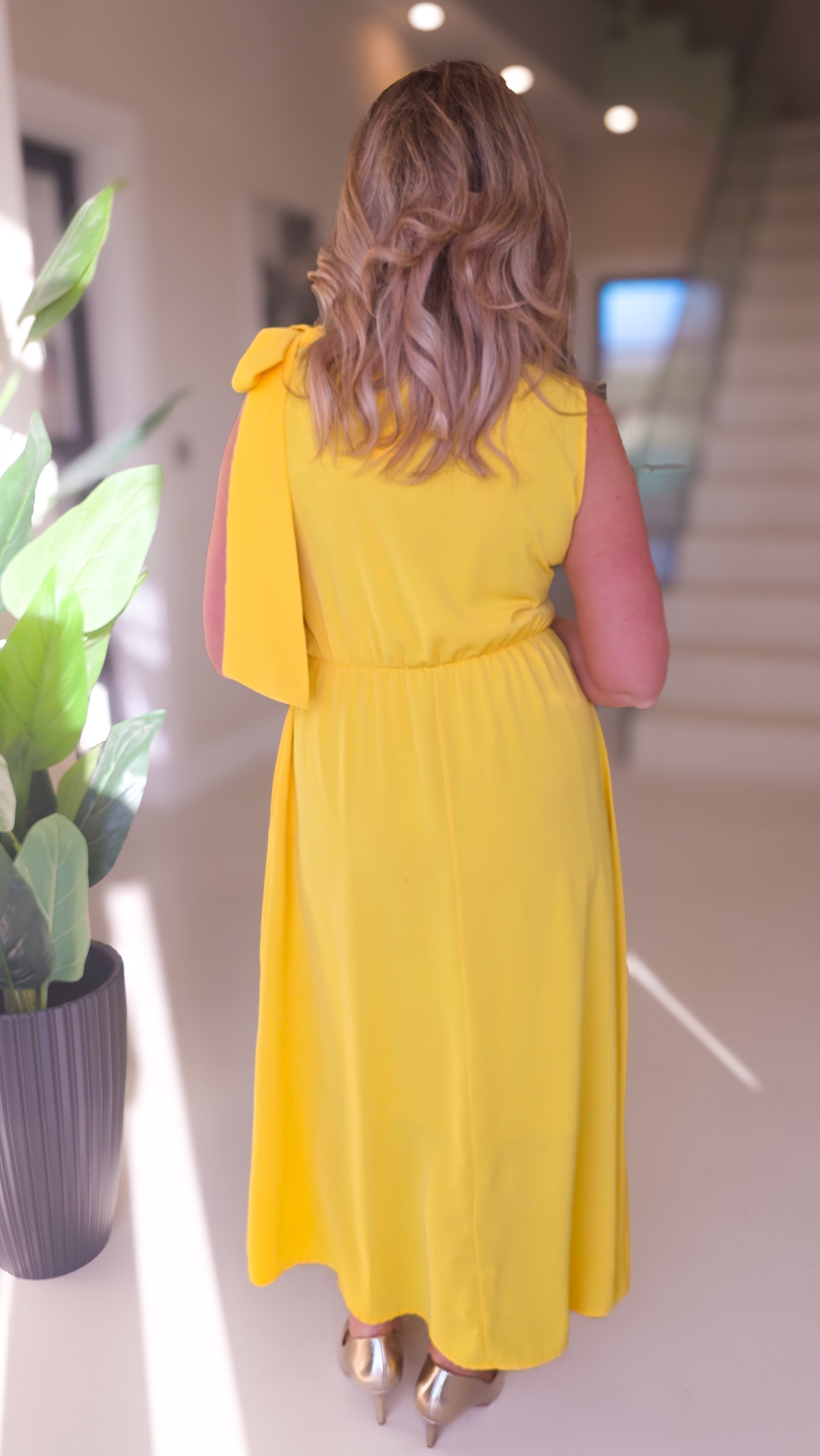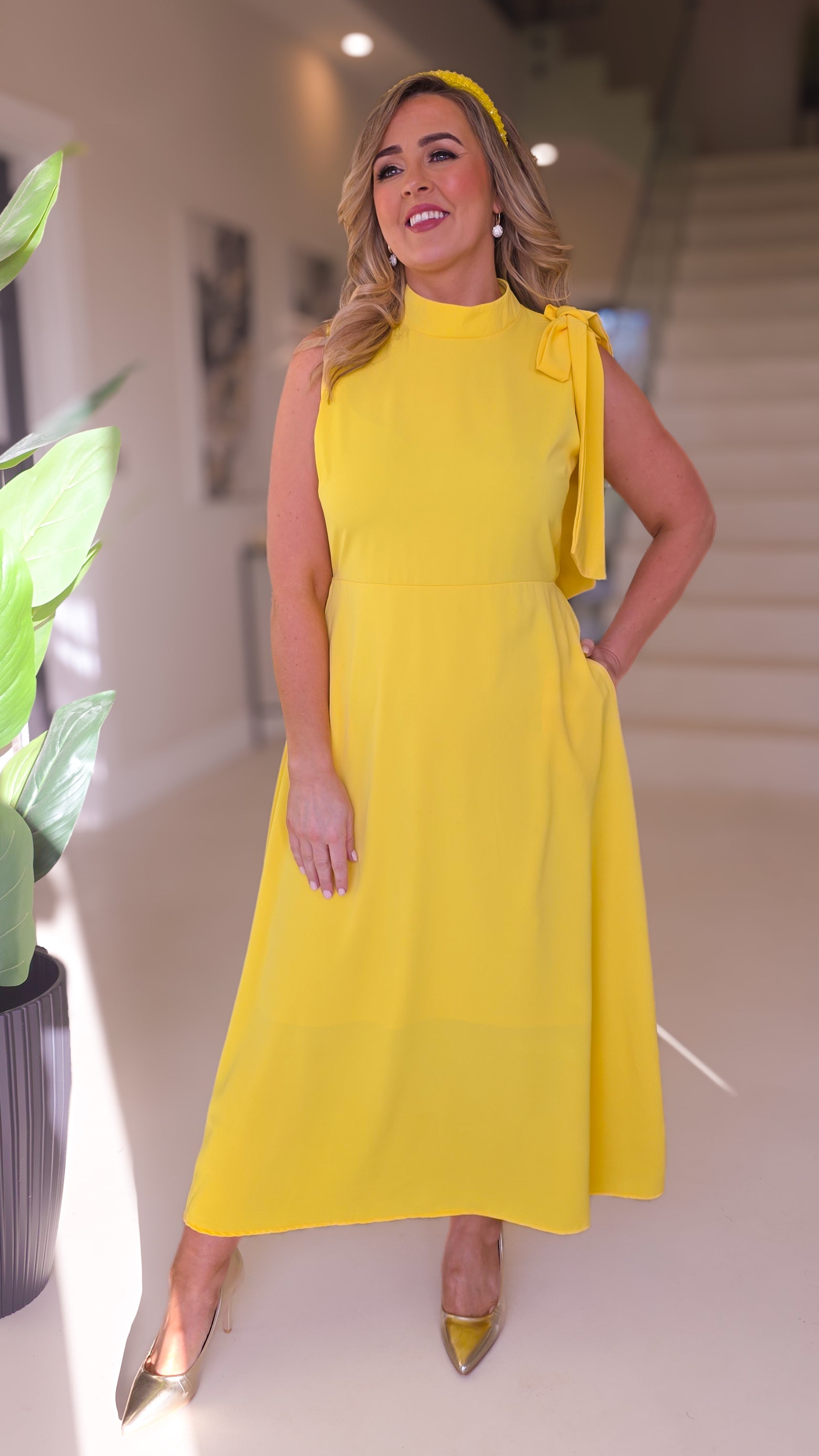 This elegant, midi-length design with a soft A-line silhouette that moves fluidly and flatters the figure. It is sleeveless with a high neckline, giving it a refined and polished look. A standout detail is the bow accent on one shoulder, which adds a touch of femininity and interest without overpowering the design. The waist is gently defined, creating shape while keeping the overall feel light and graceful.