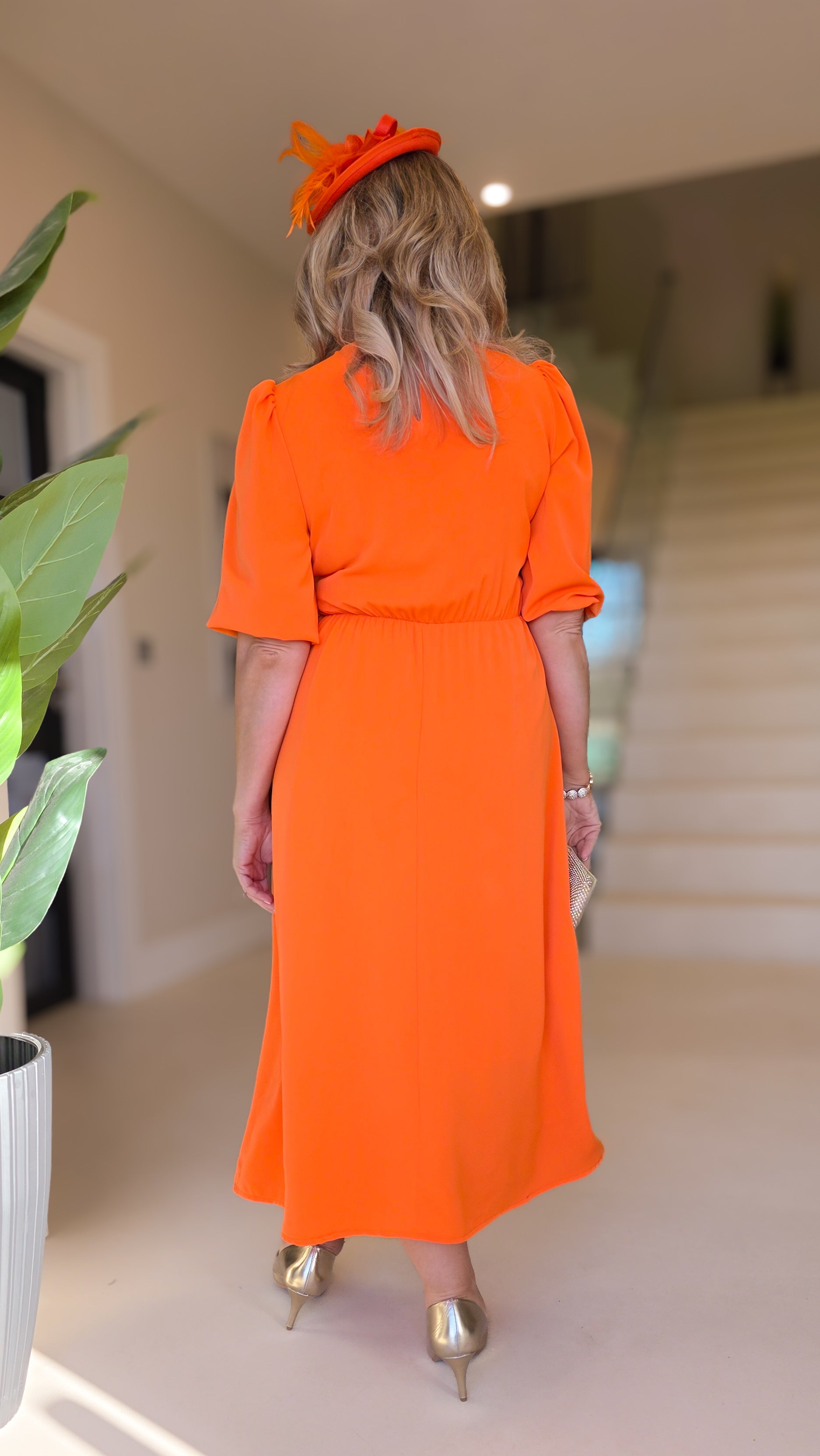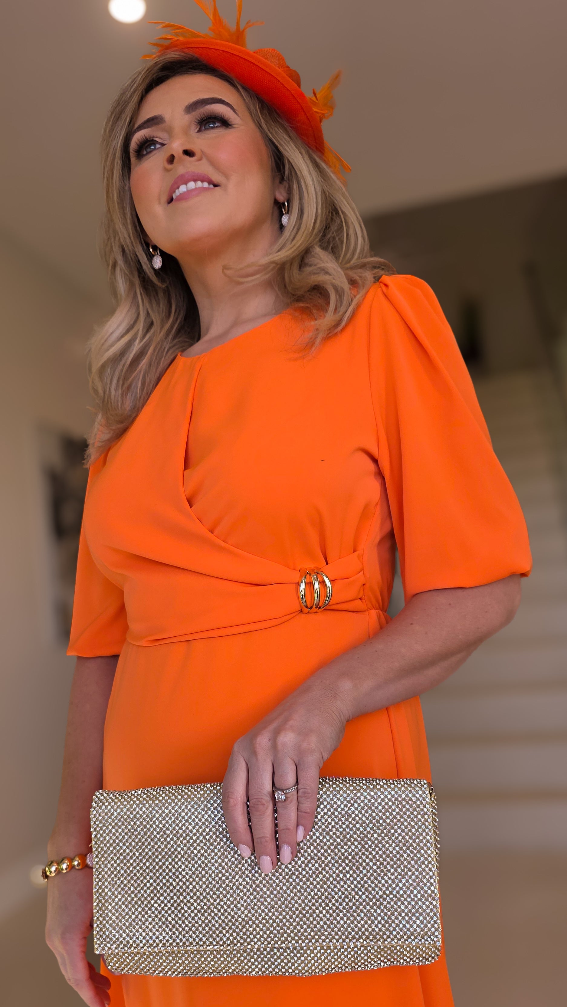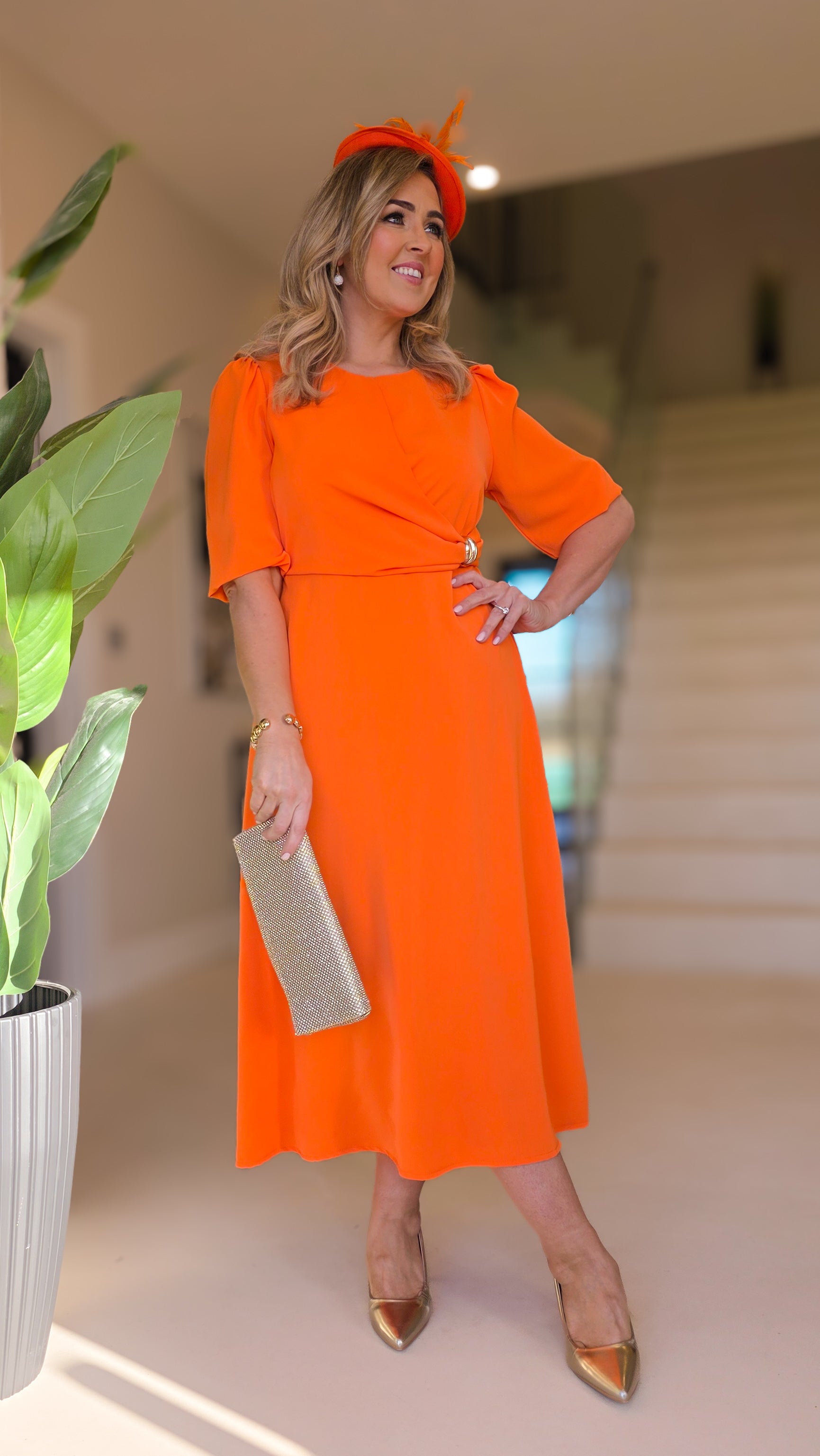 The Quinn dress has a classic midi-length style with a softly structured, elegant silhouette. It features a subtle keyhole detail opening at the neck. 3/4 gently puffed sleeves with a relaxed drape, balanced by a defined waist that creates a flattering shape. At the bodice, there is a subtle wrap-style detail with light ruching, accented by a small metallic buckle at the waist, which adds polish and visual interest. The round neckline keeps the look refined and timeless.