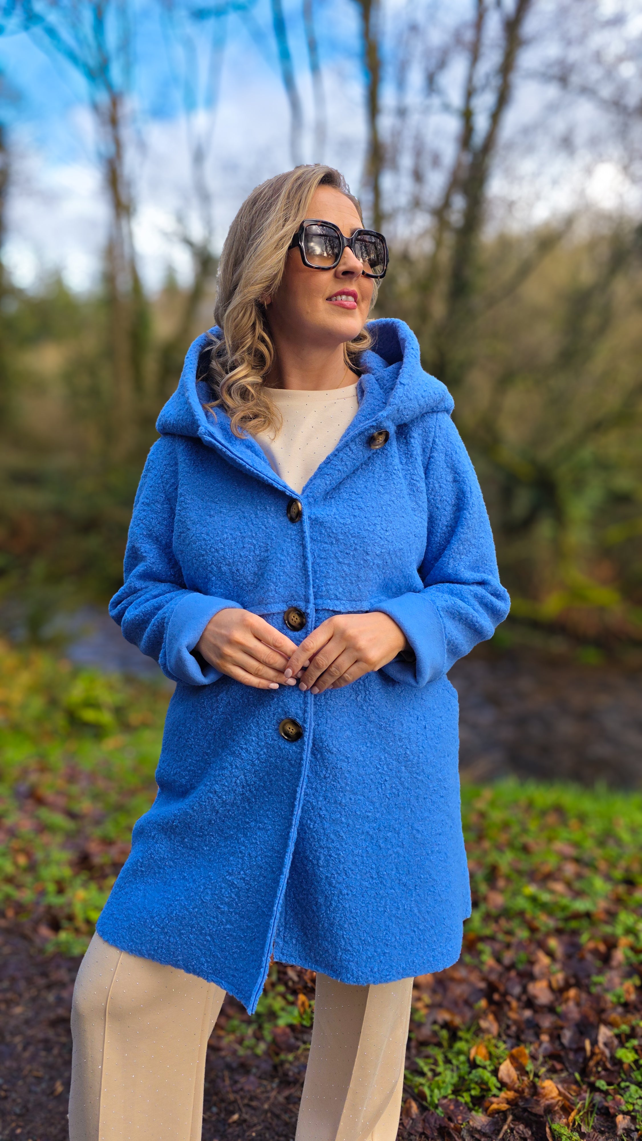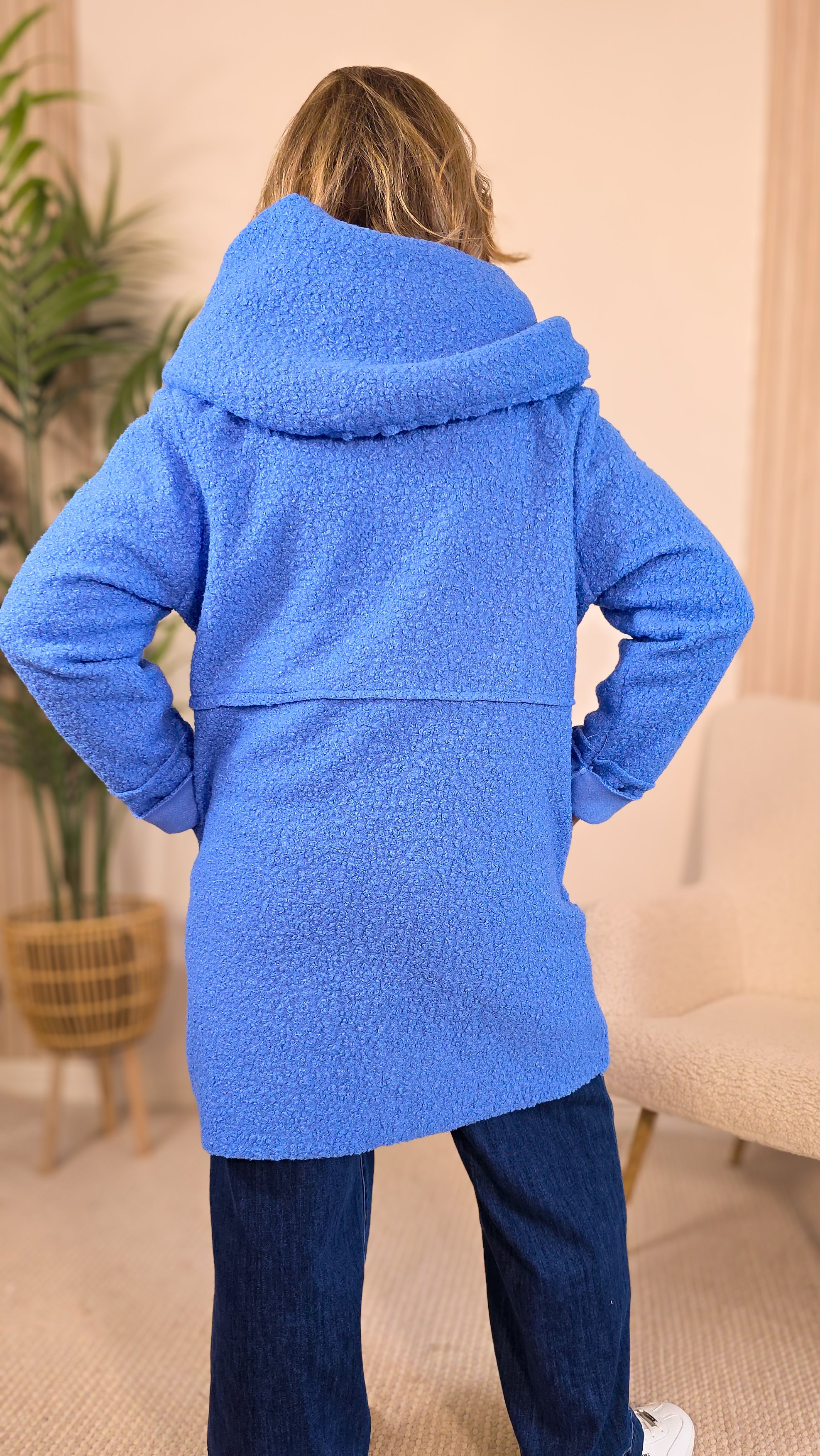 Introducing the Pippa Teddy Borg Coat in a striking shade of blue! Complete with a cozy hood and cardigan style, this coat will keep you warm and stylish all season long.