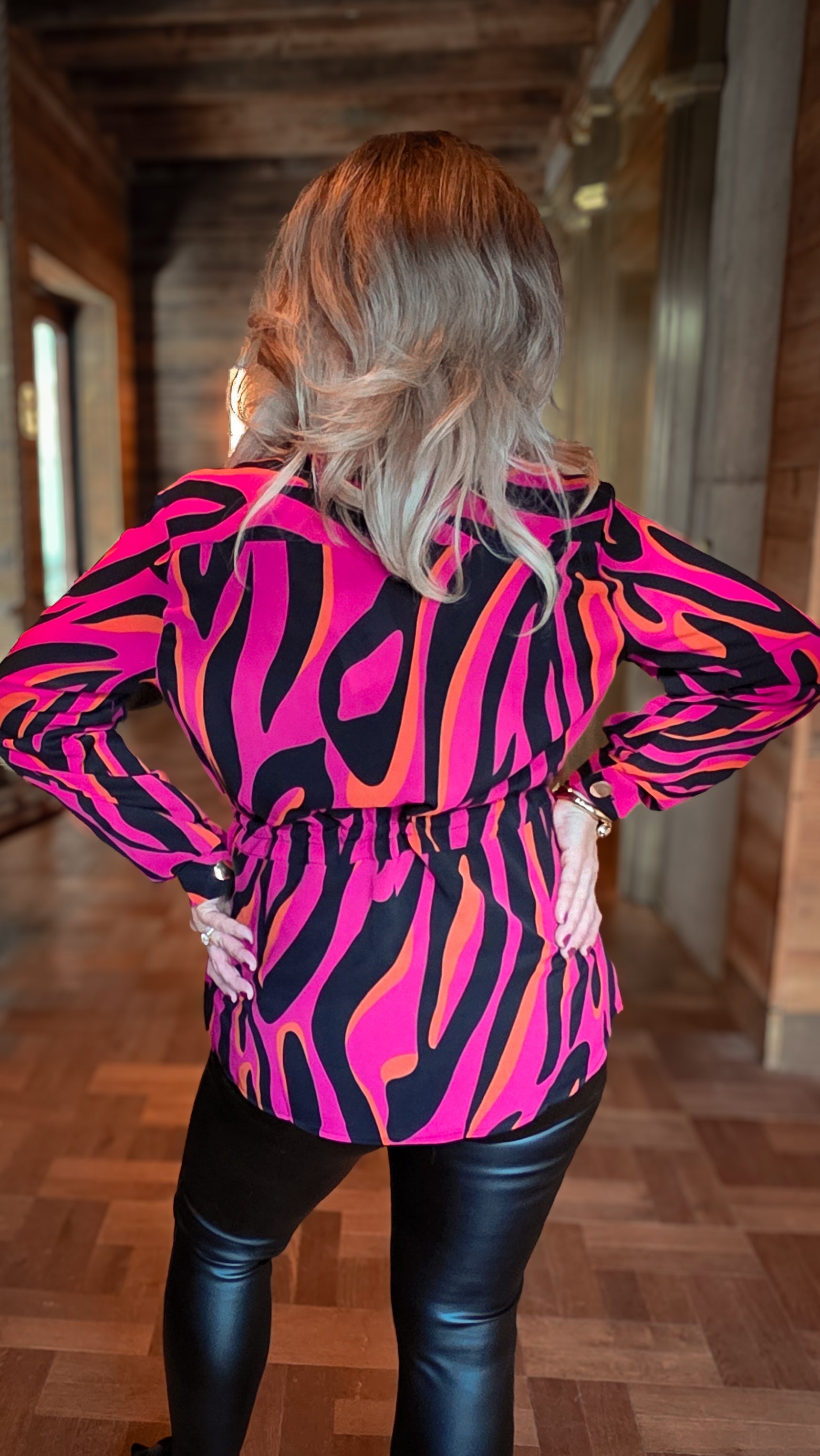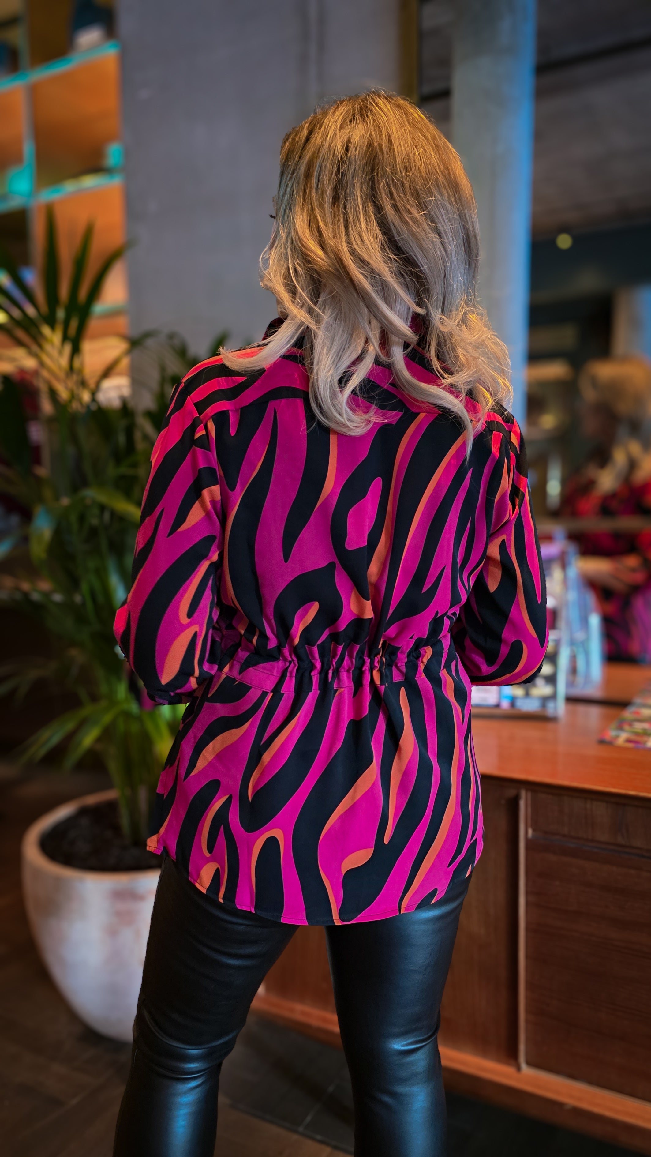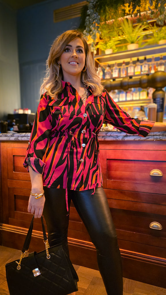 The Jennifer Shirt is a versatile shacket featuring elegant gold buttons in a striking bold print