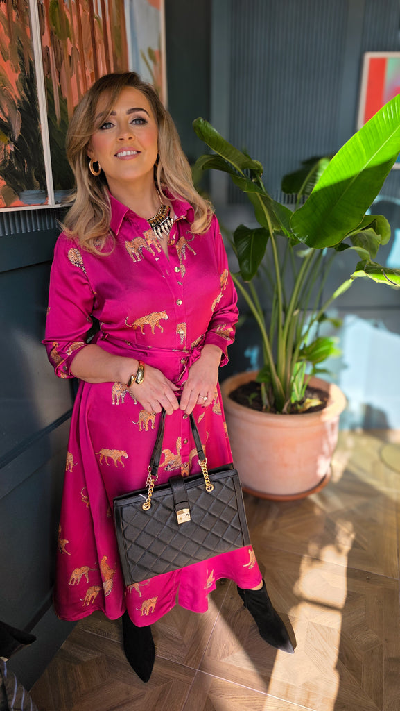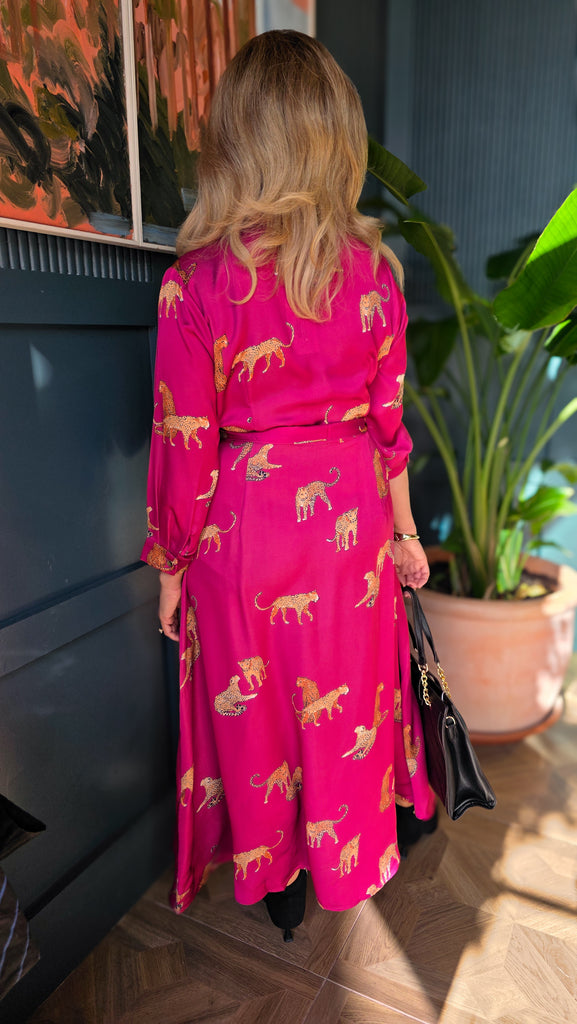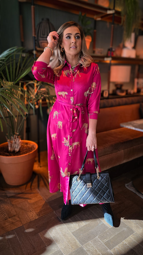 The Susan Dress is a midi shirt dress featuring elegant gold buttons in a striking bold pink print