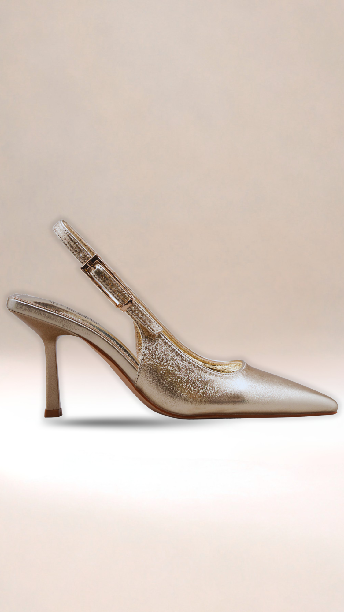 Step into confidence with the Colette Heel in Gold. This beautifully crafted pointed-toe slingback is your go-to for polished, put-together looks. The adjustable slingback strap provides a secure fit that keeps you comfortable all day long, while the elegant gold finish adds a luxurious touch to any outfit.