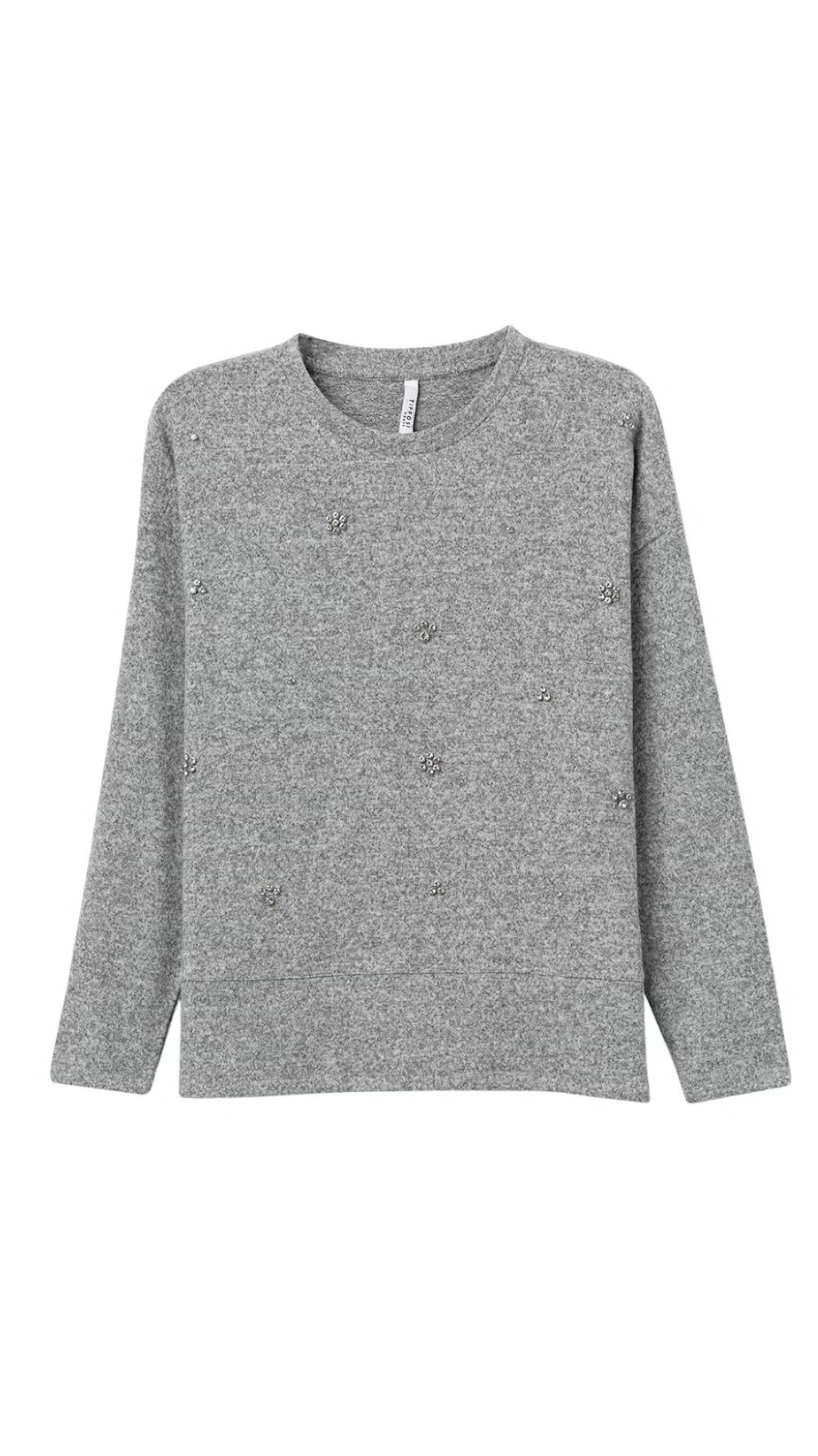 Embrace effortless elegance with this grey knit top, thoughtfully adorned with jewel details that catch the light beautifully. The soft, quality knit fabric feels wonderful against your skin while providing the comfort you deserve throughout your day.