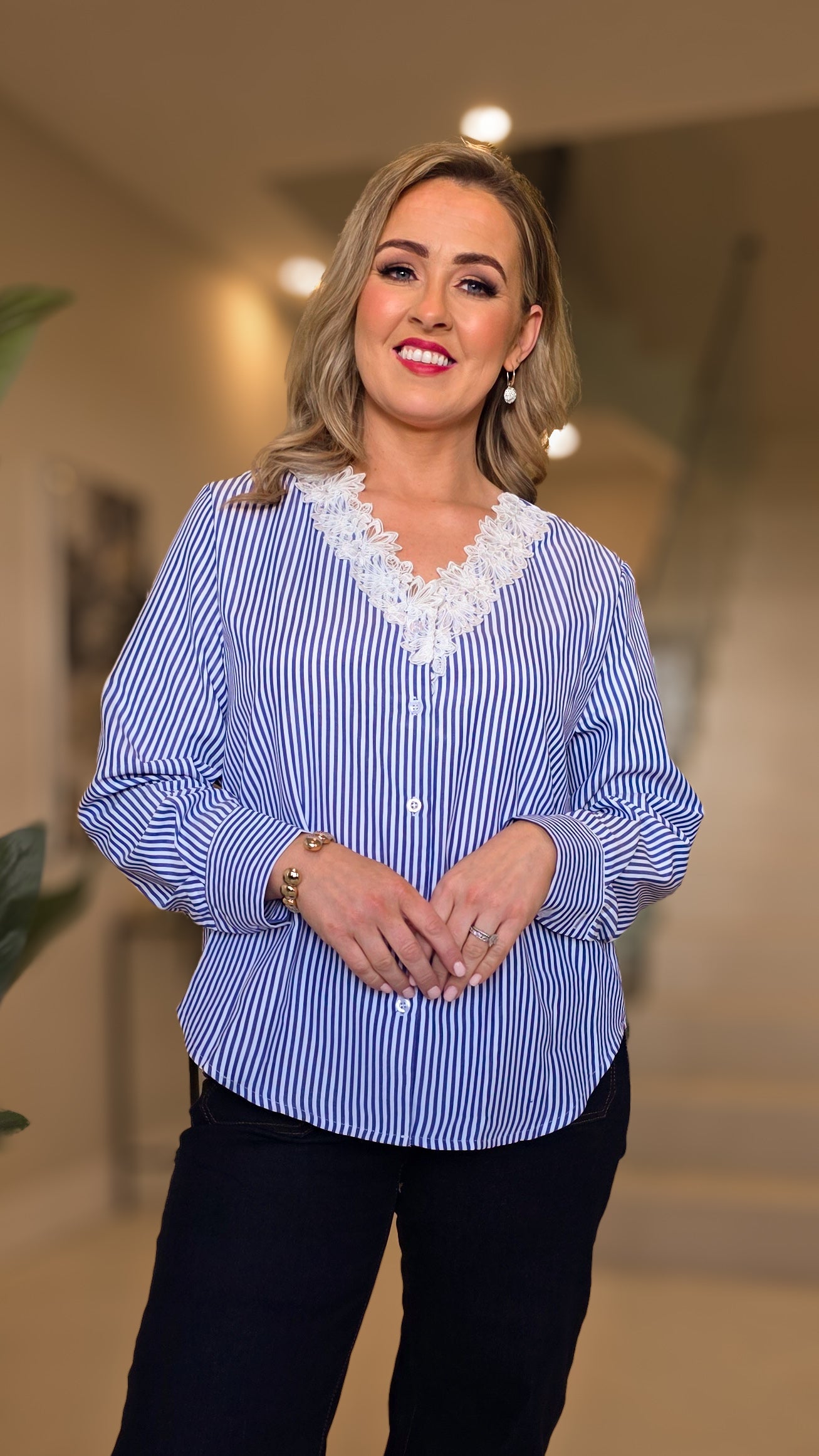 The Edel Shirt brings understated sophistication to your wardrobe with its crisp blue and white pinstripe design. Delicate crochet detailing along the neck line.